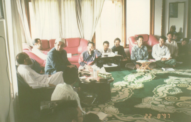 الكاتب يكمل الجزء الثاني من محاضرة الاجتهاد والتقليد وعلى يساره د. سالم سقاف الجفري ـ جاكرتا ـ الجبل 19/4/1418هـ
