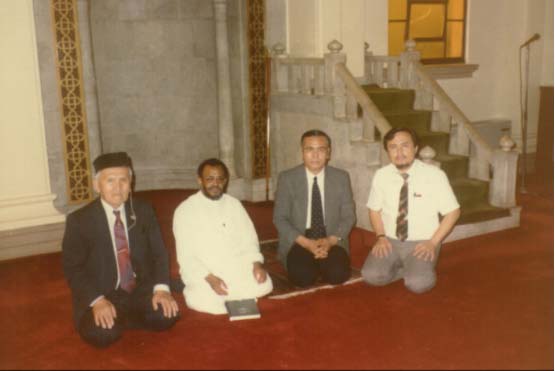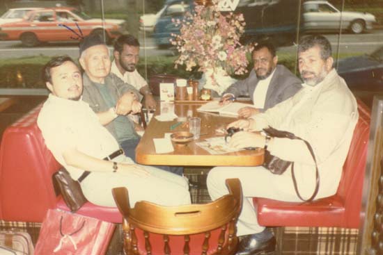 ومكثت ثماني سنوات أكتب عن تاريخ اليابان فيما يتعلق بالإسلام، وكان معي اثنان يساعدانني، وأنهيت الكتاب وهو جاهز للطبع، وهذا أول كتاب يكتب عن تاريخ الإسلام في اليابان من مسلم ياباني، ولم يكتب أحد مثله ولا يستطيع أحد أن يكتب مثله - هكذا قال – [ثم ابتسم]. من اليمين د . صالح السامرائي، الكاتب، محمد باكريم مصطفى كمورا الذي كان الحوار معه، عبد العزيز التركستاني 4/11/1406هـ ـ11/7/1986هـ ص: 89 الكاتب [الثاني من اليسار] وعلى يمينه الحاج مصطفى كامورا، وعلى يساره المسلم الياباني خالد كيبا، ثم الطالب السعودي عبد العزيز التركستاني [فقال الدكتور صالح: إن هذه ابتسامة أسف، لتعبه وعدم مساعدته في الطبع، والياباني يبتسم في أحرج الظروف على حد قول الشاعر: