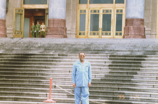 الكاتب أمام مبنى البرلمان الصيني في بكين ويرى بعض حراس المبنى أعلى الدرج على اليسار 27/2/1416هـ