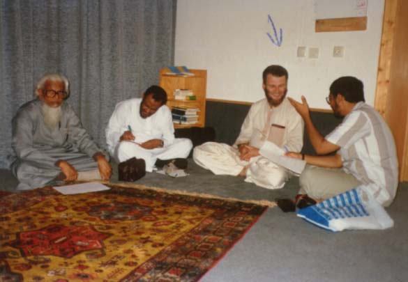 الكاتب وعلى يساره المسلم الألماني محمد صديق في مؤسسته "دار الإسلام" وعلى يسار الصورة الدكتور عبد الرحيم ف المدرس بشعبة الله العربية في الجامعة الإسلامية بالمدينة النبوية، وفي أقصى اليسار بدر الماص الكويتي 19/11/1407هـ وسألته: متى سمع عن الإسلام في حياته؟. فقال: أذكر أن أول ما سمع عن الإسلام في المدرسة، وأنني سمعت ما فيه ذم للإسلام وتشويه. وكان أول اتصاله بالمسلمين سنة 1961م في مدينة برلين حيث كانت توجد جمعية طلابية إسلامية من الألمان، وكان لها نشاط طيب جداً في ذلك الوقت. وكان راغباً أن يسمع عن الإسلام شيئاً، فحضر بعض الاجتماعات التي كانوا يعقدونها في الأماكن العامة، ومنها الاحتفال بالعيد. وبعد أن سمع من المسلمين بعض ما يتعلق بالإسلام ورأى بعض تصرفاتهم، أخذ يقرأ عن الأديان الأخرى، كاليهودية والنصرانية، وقرأ لمحمد أسد، وبعض دواوين محمد إقبال المترجمة إلى اللغة الألمانية. وكان في الأصل بروتستانتياً، وكان ملتزماً بدينه السابق. ودخل في الإسلام سنة 1962م. وسألته: عن دعوة غير المسلمين؟ فقال: من الأمور الأساسية عندنا هي دعوة غير المسلمين. وسألته: عن أهم ما يؤثر في الألمان من موضوعات الإسلام. فقال: تصحيح الروابط الاجتماعية، ولا يوجد لهذه الروابط تصحيح في أي دين مثل دين الإسلام. قال: وتوجد أمور مهمة تشغل بال الغربيين ولها حلول في الدين الإسلامي، لو فهموها جيداً فإن ذلك سيؤثر فيهم، ومثل لذلك بتلوث البيئة الذي ألقى فيه المسلم الألماني أحمد فون دنفر محاضرة بعنوان القرآن وتلوث البيئة.. وحضرها رجل من أعضاء الحزب الأخضر، فتعجب من هذه المحاضرة، وعلق عليها قائلاً: نحن نهتم بهذه الأشياء من جهة الدنيا فقط، وأما أنتم - يقصد المسلمين - فإنكم تهتمون بها ديناً. وسألت الأخ محمد صديق: هل توجد رسالة أو كتاب عن العقيدة الإسلامية باللغة الألمانية؟. فقال: لا توجد رسالة ممتازة باللغة الألمانية يمكن أن تؤثر في الألمان، وينبغي أن تؤلف رسالة في هذا الموضوع باللغة الألمانية. [يبدو لي أن الأخ محمد صديق جدير بتحمل هذا العبء لأنه يجيد اللغة العربية ودراسته للعقيدة كانت في الجامعة الإسلامية بالمدينة، ويجيد اللغة الألمانية لأنها لغته، ويمكن أن يستعين ببعض الدعاة من إخوانه في ألمانيا، ولكنه يعتذر بزحمة الأعمال وعدم وجود معاونين]. وسألته: عن مشروع "مصحف بافاريا" الذي يشرف على ترجمته والتعليقات عليه وطبعه وتوزيعه الأخ عبد الحليم خفاجي؟ فقال: إن هذه الترجمة طيبة وتحتاج إلى مراجعة من حيث الإخراج، ومع ذلك فهي دون المستوى المطلوب، وقال الأخ محمد إنه بدأ يترجم معاني القرآن الكريم، ولكنه ترك ذلك لكثرة أعماله، والترجمة تحتاج إلى عمل متواصل و مدة طويلة. وسألته: عن الوسائل المؤثرة في الألمان في نشر الإسلام. فقال: 1ـ الحياة الاجتماعية الإسلامية، كالمخيمات، وتكون فيها مناهج تربوية، ومشاركة الشخص في مخيم واحد لمدة أسبوع يؤثر فيه كثيراً. 2ـ طباعة الكتب وتوزيعها، لأن المراكز الإسلامية لا تغطي الحاجة. 3ـ الندوات العلمية والمحاضرات، وقد أقمنا ندوتين، إحداهما: عن الاختلافات الفقهية، والثانية: في موضوع اعتراف ألمانيا بالإسلام. 4ـ اللقاءات الكبيرة ونحن نقيمها كل أربعة أشهر. 5ـ الرحلات الجماعية في ألمانيا وخارجها. 6ـ إقامة معارض كتب، بعد الاستئذان من البلدية. 7ـ إقامة محاضرات ويعلن عنها في الجرائد في يوم مفتوح ويكون يوم الأحد، واليوم المفتوح معروف عند الألمان، ونحن نقيمها، و قد خصصنا حافلة للدعوة. 8ـ إيجاد معارض ولوحات فنية يكتب فيها ما يدل على معاني إسلامية تلفت النظر إلى ما تحمل. 9ـ أما الوسائل الإعلامية فقد ابتعدنا عنها، لعد وجود أشخاص يساعدوننا في نشر الحقائق الإسلامية بها، وهذا الابتعاد يسبب استغلال آخرين لتلك الوسائل. وقال الأخ محمد صديق: إن من أهم الوسائل النافعة لنشر الإسلام وتبيينه هو إنشاء مدارس إسلامية في ألمانيا. وسألته: هل تظن أن الحجة قد قامت على أهل أوربا بالدعوة إلى الإسلام وبخاصة ألمانيا؟ فقال: أغلب أهل أور