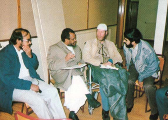 الكاتب الثالث من اليمين وعلى يساره المسلم البريطاني أحمد نور الهدى، وعلى يمين الصورة ويسارها عربيان يقومان بالترجمة. قلت له: متى سمعت عن الإسلام؟ قال:لم يسمع عن الإسلام إلا قبل ثلاث سنوات فقط [يعني بعد أربع وثلاثين سنة من عمره] وعندما كان يدرس في صغره لم تكن المدارس تدرس تاريخ الأديان. قلت له: ما وسائل الدعوة النافعة لدعوة الأوربي إلى الإسلام؟ قال: لا بد أن تكون الوسائل جذابة، وفي وسائل الإعلام المختلفة ومنها التمثيليات. وقال: إن أسلوب المسلمين في الهجوم المباشر على المسيحيين، يعتبر من الحواجز النفسية عند المسيحيين. والأولى أن يهتموا بشرح معاني الإسلام، كما جاءت في القرآن والسنة، ويكون الرد على المسيحية من خلال ذلك، وليس هو البارز. قلت له: ما الذي جذبك إلى الإسلام؟ قال: إن كثيراً من الأسئلة العقدية التي كانت عنده، لم يجد لها إجابة في المسيحية، ولكنه وجد لها إجابة في الإسلام. وقال: المؤسف أن كثيراً من المسلمين يكونون مسلمين بالولادة، وليسوا ملتزمين بالإسلام حقاً.