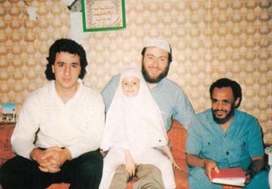 الكاتب وعلى يمينه علي أبو علي وفي حجره طفلته، ثم عبد الشكور، ميلانو إيطاليا وشرح هذا الكاتب الأديان، وقال: إن الأوروبي لا يمكن أن يكون بوذياً ويمكن أن يكون مسلماً، يعني أن الإسلام أقرب إلى الأوروبي من الأديان الأخرى. وقال أيضاً هذا الكاتب: إن كل الأفكار الأوروبية هي شخصية لم تثبت صحتها علماً، ولا بد لأوروبا من فكر ديني، والدين الذي بلائمها هو دين الإسلام. ورأى الكاتب أنه لا بد من تحطيم كل الأفكار الأوروبية وعدم استقامتها، وبين ذلك تاريخياً، وأن الديانات الأخرى ديانات سماوية فيها بعض الحقائق ولكنها غير سليمة، وأن الدين الإسلامي هو الحق الذي يجمع كل الإيجابيات وينفي كل السلبيات. وقال الأخ عبد الشكور: إنه عن طريق هذا الكتاب دخل كثير من الإيطاليين في الإسلام. واسم المؤلف: عبد الواحد يحيى. وقال الأخ عبد الشكور: إن بعض المسلمين الملتزمين يرون أن عنده شطحات صوفية، ولكنه هو يرى أنه ليس عنده شيء من ذلك. وقال الأخ عبد الشكور إنه دخل في الإسلام مباشرة دون معرفة أحد من المسلمين وكان عمره 23 سنة، وكانت دراسته للأديان والإسلام حوالي خمس سنوات. وقال الأخ علي: إنه في فترة تسيبه زار بعض البلدان الإسلامية وأدخل السجن في المغرب لسبب ما. وخلال زياراته تلك عرف الأذان وسمع عن الصلاة والصيام وسمع القرآن - قال: وهو موسيقار - وتأثر بسماع القرآن الكريم، وكذلك تأثر بمنظر الصلاة وتابع بحثه وطلبه للحقيقة في طريقة الهيبيز والثورة الاجتماعية، فلم يجد فيهما شيئاً ينفعه فتركهما. وفي هذه الفترة هداه الله لمعرفة الإسلام لمعايشته المسلمين سنة في ساحل العاج. ثم رجع إلى أوروبا والتقى المسلمين. وفي النهاية جاء إلى المركز الإسلامي في ميلانو وتعرف على الشيخ عبد الرحمن [سبق الحديث عنه] الذي شرح له كلمة التوحيد ومبادئ الإسلام، كما شرح له كيف أقام الرسول صلى الله عليه وسلم دولة الإسلام، وشرح له المعالم الإسلامية والنظام السياسي الإسلامي، والحرية والعدالة في الإسلام والمساواة فأشبع ذلك نفسه. وقال: إن تأثير القرآن عندما يسمعه كبير جداً عليه.. وقال: إنه سمع أغاني أم كلثوم التي تصاحبها الموسيقى والآلات الفنية المختلفة، وسمع القرآن الذي يقرأه شخص واحد بدون أن تصاحبه أي آلة موسيقية فكان تأثير سماعه للقرآن فيه لا يدانيه شيء. وقال - وهو موسيقار كما سبق -: إن أحكام التجويد التي يؤدي بها تالي القرآن قراءته، لو أراد أن يقلدها بمئات الآلات الموسيقية والحس الموسيقي، ما قدر على ذلك فهي بذلك - أي قراءة القرآن - تجعل السامع يشعر أنها فوق قدرة الإنسان، وهي تدخل إلى القلب مباشرة. قلت له: لو اتجه الكفار لسماع القرآن بصوت حسن، وهم لا يفهمون معانيه، هل تراهم سيتأثرون بذلك فيبحثون عن الإسلام؟. فقال: نعم، وقد دخل كثير من الموسيقيين الأمريكان والأوروبيين عن طريق سماعهم القرآن في الإسلام، وبعضهم ما زال يعزف إلى الآن. قال الأخ علي: وأما أنا فقد تركت العزف. [ذكر سيد قطب رحمه الله قصة امرأة يوغوسلافية سمعت تلاوة القرآن وهي لا تفهم اللغة العربية وأظهرت تأثرها بذلك. راجع كتاب: في ظلال القرآن: 2 (2/821-822)، (3/1786) طبع دار الشروق، قلت: وسأذكر إن شاء الله في الكتاب الذي أعتزم كتابته وهو (البلاغ المبين) ما يحضرني في هذا الموضوع]. قلت للأخ علي: هل وجدت فرقاً بين حياتك قبل الإسلام وحياتك بعده؟. قال: إنه بعد إسلامه عرف الحلال والحرام، وأصبح منهجه الذي يسير عليه واضحاً، ولا توجد في حياته مشكلات عقدية وأخلاقية تحتاج إلى حل. وقال الأخ عبد الشكور: إنه قبل الإسلام كانت تصرفاته كلها منصبة على ما يراه في مصالحه هو شخصياً (أي إنه كان أنانياً) وأما بعد الإسلام، فإنه أصبح يفكر في علاقته بربه وعلاقته بنفسه وأهله وعلاقته بغيره من المسلمين وغيرهم. وسألتهما: هل يهتم المسلم غير الإيطالي بالمسلم الإيطالي؟. فأجاب الأخ علي: بعضهم يهتم، وبعضهم لا يهتم، وأفضل مساعدة للمسلم الجديد أن يوضح له الإسلام الصحيح، وأفضل من يساعد المسلم الإيطالي الجديد هو المسلم الإيطالي القديم، ل