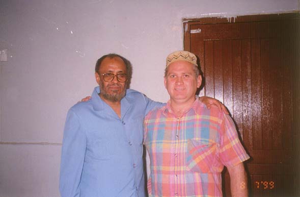 صورة منصور [يمين] مع الكاتب في دار التوحيد/ مدينة دربن/ جنوب أفريقيا وكان تاريخ الرسالة التي قدمها الأخ منصور جوبير لأساتذته: 27/10/1995م. وجاءه الرد من أساتذته بتاريخ: 30/10/1995م، خلاصته: (بموجب الخطاب الذي جاء منك وجدنا أنك غير مؤمن بديانتنا، ولا يحق لك أن تستمر في كتابة الرسالة، وقد حكم عليك بالطرد من جميع الكنائس، ولا يحق لك الاتصال بنا ولا مراسلتنا ولا تستحق منا الرد على رسائلك). قلت له: هل كنت تتوقع أن يرد جوابا على أسئلتك ؟ قال: كنت أعلم أنه لا يجد جوابا على هذه الأسئلة، لأني قد مررت بتجربة مع الأستاذ الذي سبق أن تعاملت معه قبل هذا، حيث كنت أطلب منه الاطلاع على النسخ الأصلية من الإنجيل فيرفض، ويقول: اتبع ما أقوله لك فقط، وهم دائما يدرسون الطلاب في غير النسخ الأصلية، والطلاب لا يفهمون اللغة القديمة. وإنما أردت من تقديم الخطاب لهؤلاء الأساتذة، أن اطمئن على ما كنت أرجحه في نفسي، من كتمانهم ما هو موجود في النسخ الأصلية، وتضليل الطلاب والأتباع. ومن حسن حظي أنني تعلمت اللغتين: العبرية القديمة واليونانية القديمة، وهذا ساعدني على معرفة هذه الأمور، وقد كانت هذه الأسئلة موجودة عندي قبل التسجيل في الماجستير، وكنت أقدمها لأساتذتي، ولكني لم أجد لها عندهم جوابا، وهذا جعلني أتبحر في العلم لمعرفة الحقيقة. وتيقنت أنهم كانوا يعرفون هذه الحقيقة ويكتمونها. وقال الأخ منصور: إن في إنجيل برنابا ذكر أن عيسى عليه السلام أثبت رسالة محمد صلى الله عليه وسلم، وذكره باسمه، فقال: (سيأتي رسول من بعدي، اسمه أحمد أو محمد) وفيه أيضا: (أن آدم رأى اسم محمد مكتوب في السماء). لفظ الجلالة (الله) ذكر في التوراة القديمة 7 آلاف مرة. وقال الأخ منصور: لقد أحصيت ذكر لفظ الجلالة بنصه (الله) في التوراة القديمة، فوجدته تكرر سبعة آلاف مرة. وقد طلبت من الأخ منصور أن يكتب في دفتري بخط يده ما يدل على قوله هذا، فكتب النص الآتية صورته قريبا. قلت له: ماذا فعلت بعد طردهم لك، وهل ندمت على ما حصل؟ قال: اعتزلت الكنيسة، ولم أندم على ذلك، وقد نبذني أهل ملتي حتى زوجتي وأسرتها. تمهيدات ربانية لدخوله في الإسلام. قال الأخ منصور: وقد سبقت تمهيدات هيأها الله لدخولي في الإسلام: لتمهيد الأول: أنني قرأت ترجمة معاني القرآن الكريم، سنة: 1997م وشعرت في نفسي أنني مسلم. التمهيد الثاني: أنني كنت أكره أكل لحم الخنزير كراهة شديدة. التمهيد الثالث: أنه تم ختاني وأنا في سن السادسة من العمر، وأنا الوحيد الذي ختن في العائلة. التمهيد الرابع: أنني كنت في شك دائم من عقائد المسيحية، وكنت في حرب نفسية داخلية في هذه العقائد، وكنت دائما ذا ميول عدوانية، وكنت قاسيا مع زوجتي. وكان التمهيد الأهم هو ما حصل أخيرا من اطلاعي على تلك النصوص في الكتب السماوية القديمة وموقف أساتذتي منها. هذه كلها كانت تمهيدات هيأها الله تعالى لي للدخول في الإسلام. وسألته عن رتبته في المسيحية ؟ فقال: كنت متقدما على 350 قسيسا في الكنيسة. حسن الختام. لقد أصبحت في حقيقة الأمر مسلما، وكنت أبحث عن بعض المسلمين ليشرحوا لي الإسلام ويقبلوني معهم، فذهبت إلى العلماء، فلم يتفاهموا معي، وذهبت إلى مكتب ديدات، فلم يتفاهموا معي، وأعلنت إسلامي لأسرتي، في شهر فبراير من هذا العام: 1999م، وسميت زوجتي اسما إسلاميا (شريفة) واسمها الأصلي: (MERLE) وسميت ولدَيَّ (زهيرا) و (عُزَيرا) وغضبت زوجتي وانفصلت عني، وغضبت أسرتي كلها، وأخذ ابن أخت زوجتي المسدس ووضعه على رأسي مهددا لي بالقتل. ثم هداني الله إلى الاجتماع بالسيد وليد السعدي الذي آواني واحتضنني، وأنا الآن أعمل معه وأقوم بالدعوة إلى الإسلام بما أتعلمه من مبادئ هذا الدين، فالحمد لله. وقد هدى الله زوجتي، فدخلت في الإسلام قبل أسبوعين، وعمرها 32 سنة. وأصبح ولداي مسلمين، وهما: زهير وعمره: 8 سنوات، وعزير وعمره 17 شهرا. وقد تعلم ابني: زهير سورة الفاتحة منذ ست سنوات، ولا أدري من أين تعلمها ؟ كان يترجم بيني وبين الأخ منصور: الدكتور فيصل مراد السوداني، وهو من العاملين في مكتب الأخ وليد السعد
